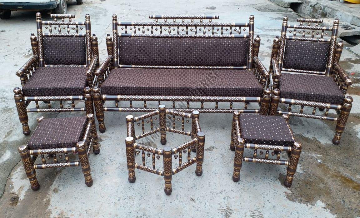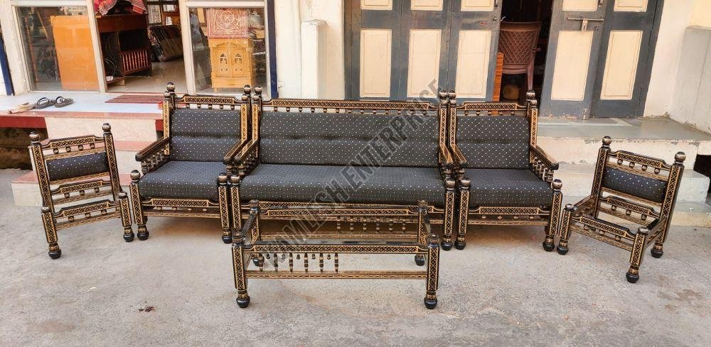 We offer an exquisite 7 Seater Wooden Sofa Set crafted in traditional Sankheda colors and lacquered finish. Made from solid hardwood, this authentic Sankheda handcrafted furniture showcases a traditional Indian design with a high-gloss lacquer polish. Ideal for living rooms, this wooden sofa set exudes elegance and charm. Perfect for exporters, suppliers, and traders looking to add a touch of Indian craftsmanship to their business category. Elevate your space with this timeless piece that seats 7 comfortably, combining beauty and functionality seamlessly.